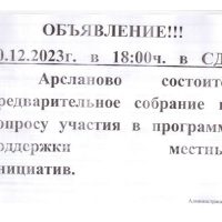 01.12.2022,02.12.2022,05.12.2022года в с. Арсланово прошли предварительные собрания по вопросу участия в программе поддержки местных инициатив в 2023г. Заслушали информацию о реализации проектов развития общественной инфраструктуры, основанных на местных инициативах Рассмотрели актуальные проблемы села Арсланово для выбора проекта.
