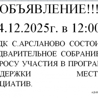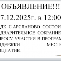 Уважаемые односельчане!!! 25.12.2025г в 12:00ч. в здании СДК с. Арсланово состоится итоговое собрание по ППМИ-2026. Просим принять активное участие.